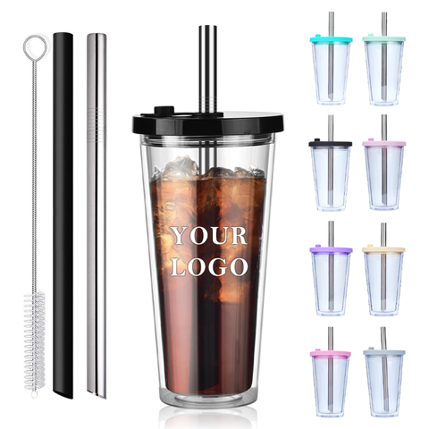 クロスボーダープロモーション二層プラスチックカップふたとストロー透明プラスチックウォーターボトル16OZドリンクカップロゴ付き